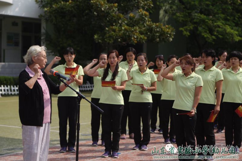 我校(园)退休老领导老教师代表、原山东省实验小学校长刘运芳带领全体教师进行宣誓活动