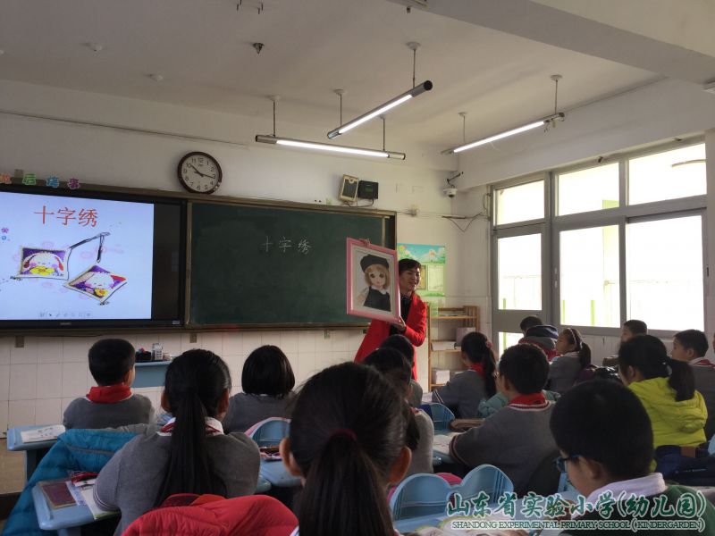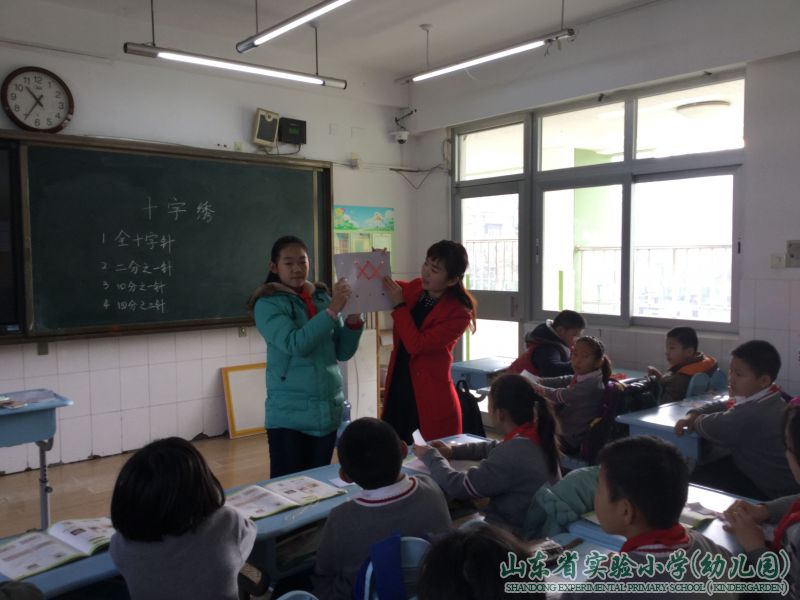 11月底,教研组内李洪胜、吕文环以及李凤舞三位专职教师聚在一起,开展了主题为“我型我绣 绣出精彩”的教研活动。活动由教研组长李凤舞老师主持,围绕如何开展“十字绣”课题的探究进行了精心的研究,李老师注重发挥教师群体力量,倡导教师之间的合作,成立了综合实践活动“智囊团”,李洪胜老师积极献计献策,多次提出宝贵意见。吕文环老师积极承担执教研究课的任务,尽管在这个领域是新手,但她虚心求教,静心备课,精心制作课件,一次又一次地进行试讲。经历了三次课例打磨,在两位李老师的指导帮助以及班主任韩祥鹏老师的大力支持下,12月2日上午,吕文环老师带领五年级三班的学生为大家呈现了一堂精彩的公开课——《快乐十字绣》。课上吕老师采用了多种教学方法:一是体现教师的主导性,由教师向学生传授十字绣的基本针法,主要利用讲授法、演示法、呈现法等。如:通过多媒体的教学手段展示多种十字绣作品,欣赏十字绣作品,先从视觉上引起学生的兴趣;其次,借助微视频放大教师的操作过程,让学生看清操作过程;二是师生互动,借助师生对话来共同思考、共同操作、共同解决。针对个别动手能力不强的学生,吕老师采取手把手地教授。三是体现学生的自主性,主要采用分组合作探究法,在绣作品时,让学生运用自身原有的知识与能力,自己确定主题、完成作品。
