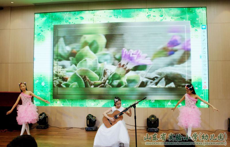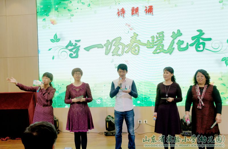 与电子书包有机整合的“赛诗大会”和全体学生的古诗词背诵展示将全场带入了诗情画意的“第三幕 诗意春天”。深厚的古诗词积淀,精彩的古诗词诵读,赢得了在场老师的一致称赞。优美舒缓的吉他弹奏之后,五年级语文组的老师们走上舞台,一首诗朗诵《等一场春暖花开》,把在场师生带入了如梦似幻的唯美意境之中。