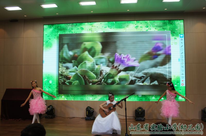 与电子书包有机整合的“赛诗大会”和全体学生的古诗词背诵展示将全场带入了诗情画意的“第三幕 诗意春天”。深厚的古诗词积淀,精彩的古诗词诵读,赢得了在场老师的一致称赞。优美舒缓的吉他弹奏之后,五年级语文组的老师们走上舞台,一首诗朗诵《等一场春暖花开》,把在场师生带入了如梦似幻的唯美意境之中。