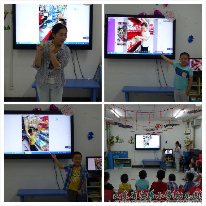 进入超市,孩子们仔细地观看物品的价格,精打细算,“服务员”(吴老师扮演)不时为孩子们介绍物品的名称、用途,讲解购物流程。在遇到购买困难时,老师们鼓励孩子大方自信地和“服务员”表达交流,通过询问、互助等方式自行解决遇到的问题。
