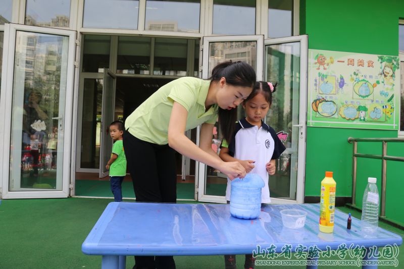 在一片称赞声中,“自制泡泡水”也跟大家见面啦,这个实验由李明泽小朋友进行演示,茶水、白糖、洗洁精,这三种在日常生活随处可见的材料放在一起就能让小朋友们一起吹泡泡,这真是太有意思了!很多小朋友都被这自制的泡泡水吸引,纷纷上台尝试用吸管吹出漂亮的泡泡。