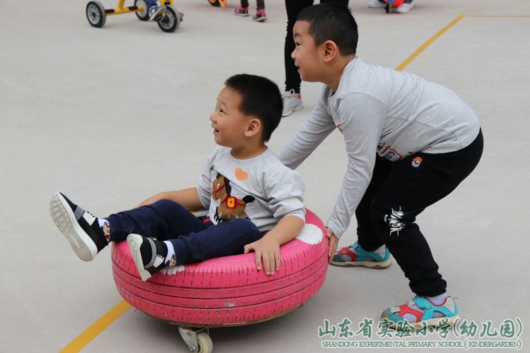 好热闹啊,孩子们骑着小车,推着小推车在赛道上开心的追逐。
