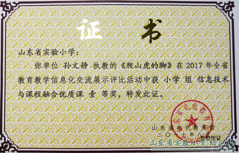 其中,孙文静老师执教的《爬山虎的脚》荣获山东省电化教育馆颁发的小学组信息技术与课程融合优质课一等奖。