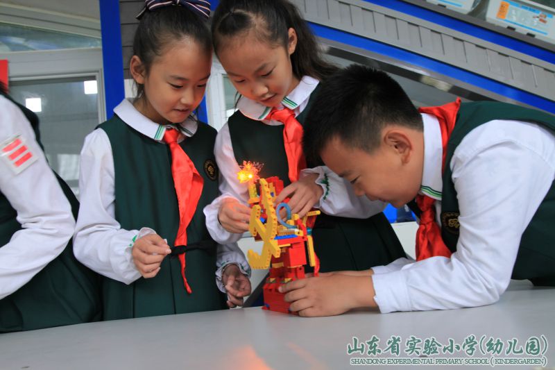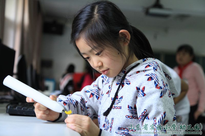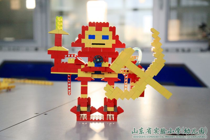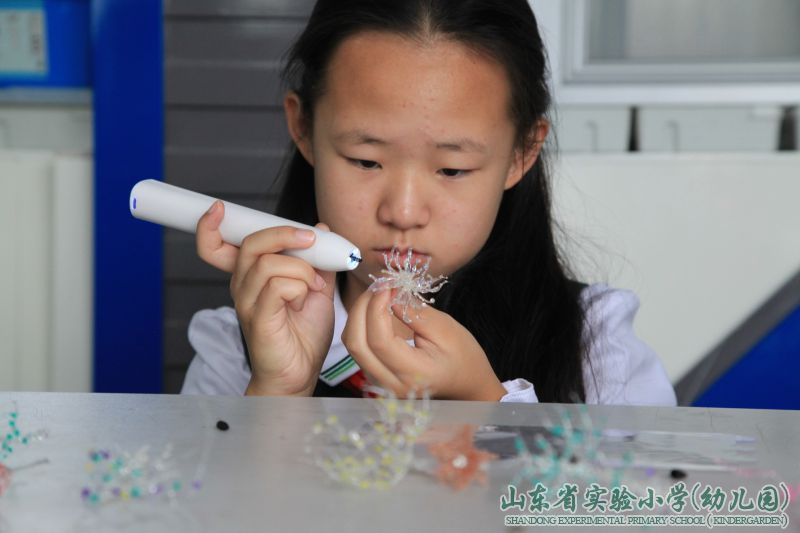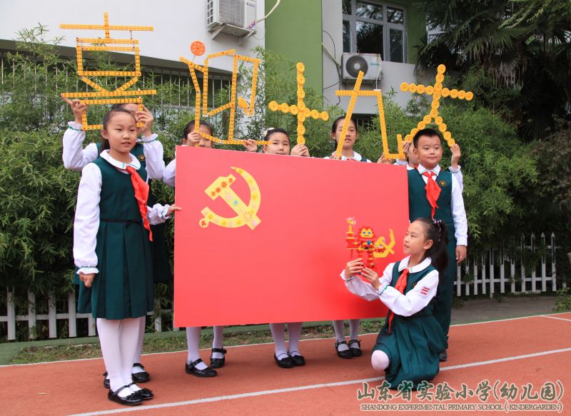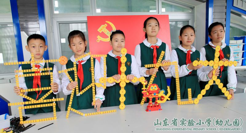 鲜艳的党旗上“鲜花”拼成的党徽熠熠生辉,党旗周围是队员们创意拼出的“喜迎十九大”字样,美丽的图案映衬着少先队员灿烂的笑脸,那朵朵“鲜花”正是出自他们之手,由光敏树脂材料的3D打印笔制作而成,是学校“创客空间”课程上诞生的佳作。瞧,那个手捧党徽的小小机器人也是队员们的用心之作,展现了省实验小学队员们的创意巧思,表达了他们迎接党的十九大的喜悦之情。