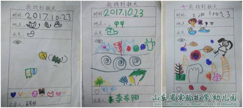 大家开心地记录着看到的秋景,边画边讨论着:“我找到了秋天,小草变黄了,小虫子准备冬眠了。”“秋天还有红色、黄色的树叶、丰收的果实......”“老师,秋风太大了,冻死了,还把我的表格刮走了,哼,我得找几块石头压着它。”说着找来四块小石头,把记录表压上……孩子们在真实的体验中,更全面地了解了秋天天气对人和动物的影响,在积极参与观察、探索和交流中加深了对秋天的了解。