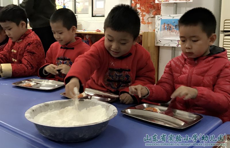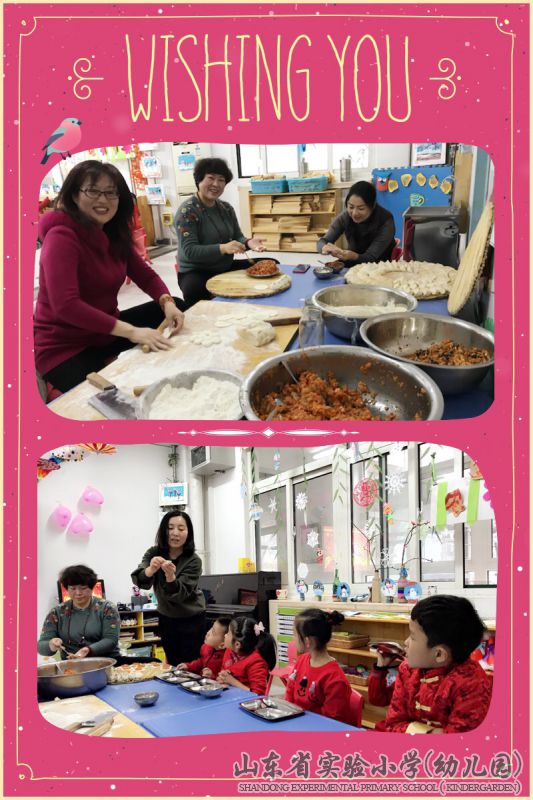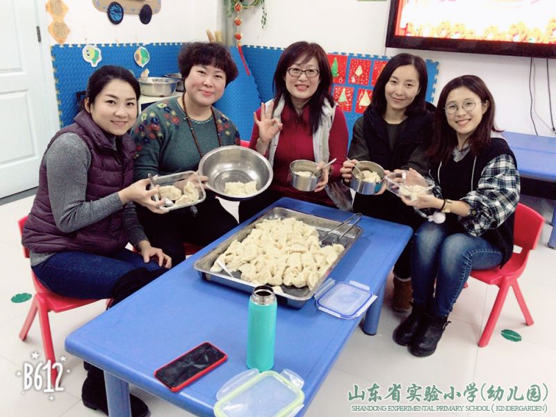 联欢活动进行的同时,宋建芳主任、颜丽老师、韩晓婕老师在大班教室为大家包水饺,他们一边包水饺一边观看联欢活动。老师们有的和面、有的擀皮、有的包、有的煮,一个个饺子象征着幸福和团圆,充满了过大年的气氛。