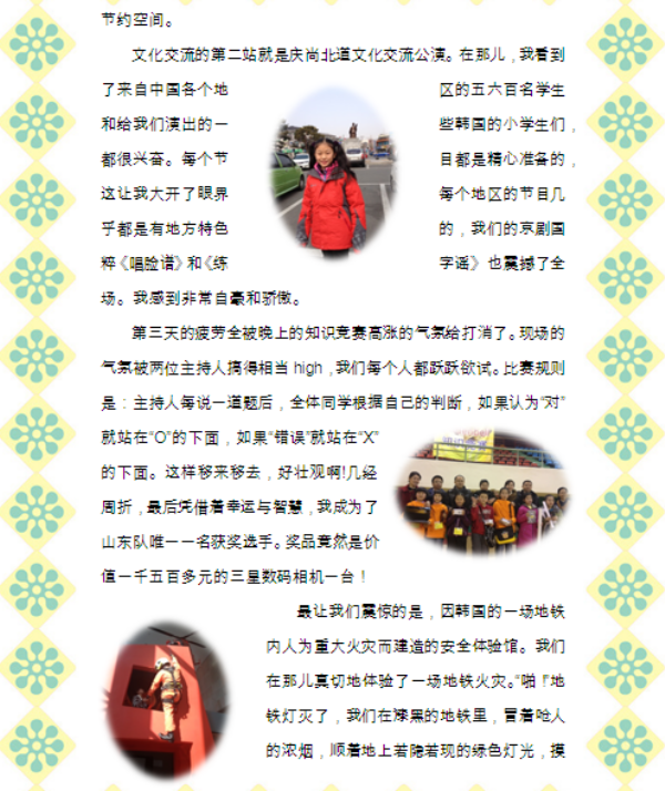 活动期间,韩国庆尚北道政府、庆尚北道教育厅特别举办了隆重的欢迎仪式,小营员们参加了文化交流活动演出和知识竞赛。在两国文艺交流活动中,韩国青少年为中国的小客人献上了具有本国浓郁风情的器乐演奏、朝鲜歌舞、跆拳道和街舞劲爆组合表演,让中国小朋友充分感受了韩国文化的魅力。中国青少年表演的舞蹈《剪纸姑娘》、葫芦丝合奏《月光下的凤尾竹》等节目也深受观众的喜欢。我校的小营员表演了《说唱脸谱》、《练字谣》两个节目,在说唱舞蹈的过程中,孩子们优美的肢体语言、典雅的服饰外装和天真富有童趣的表演,既展示了京剧和书法两大中国国粹的魅力,又全方位展示了我校少年儿童良好的精神面貌和风采,赢得了中韩观众的一致好评。更为值得一提的是,在知识竞赛环节中,通过全体家长、老师和同学们的团结合作,我校不仅有一名小营员获得了个人第三名的好成绩(奖品是三星数码相机),集体还赢得了当晚的最大奖“宵夜披萨饼券”,更是令小营员们激动不已。