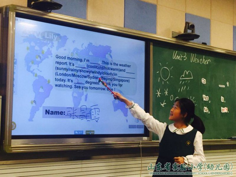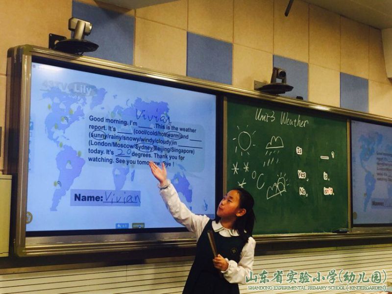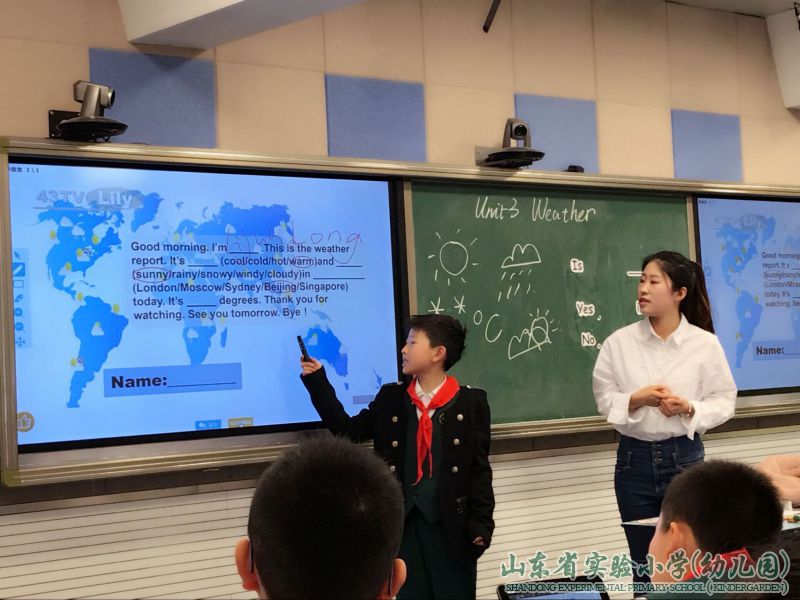 在课堂导入环节,蒋俊老师播放了两段风格截然不同的英语天气预报的视频,有趣的视频内容逗得学生们哈哈大笑,学生的兴趣被激发了出来,weather report(天气预报)的训练环节也非常自然的引了出来。随后,老师通过电子书包下发题目,让大家完成自己的天气预报内容,并鼓励学生上台扮演weather reporter(天气预报员)播报自己完成的天气预报内容,给了学生们更多的展示练习的机会。