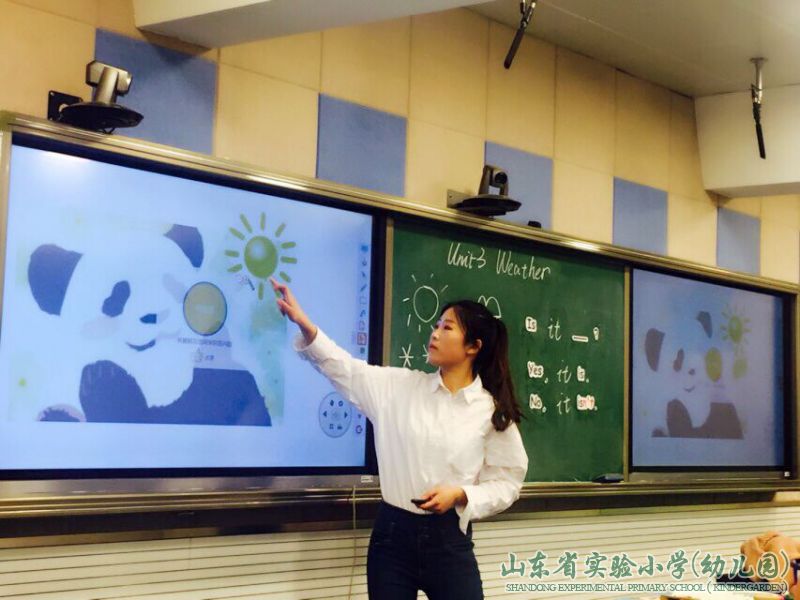 首先,在学校的录播教室里,苗校长、黄主任和英语组老师集体观摩了年轻老师蒋俊的“电子书包”公开课,主题是weather(天气)。听课的领导和老师一进教室,四年级三班的学生们就热情的用英语打招呼,欢迎老师们的到来。紧接着,“电子书包”公开课正式开始,蒋俊老师流利的英语口语、循循善诱的提问和如沐春风的笑容,让学生们迅速进入了英语学习的状态。