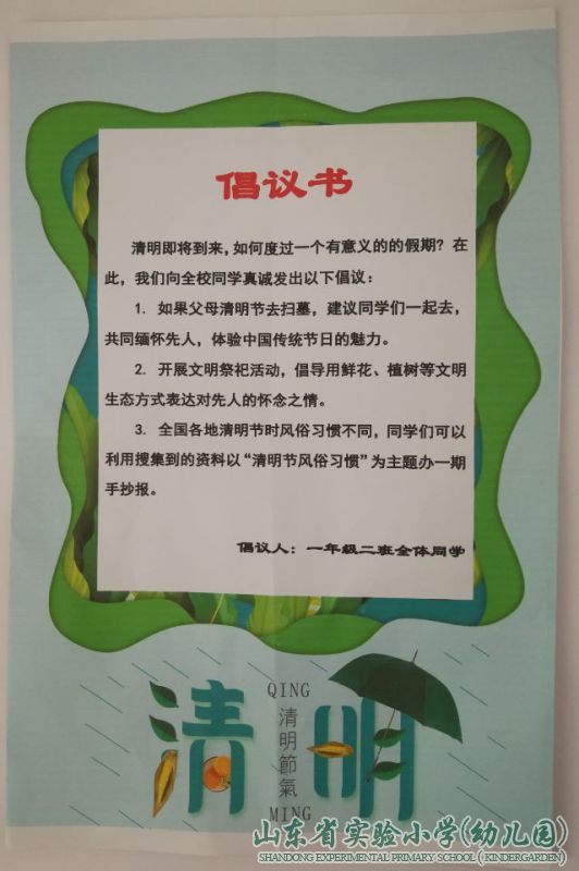 清明小假期即将到来,如何度过一个有意义的的假期?一年级二班的同学们,向全校同学发出了倡议。