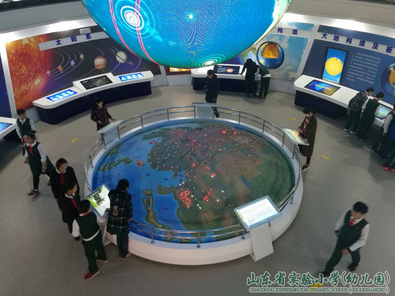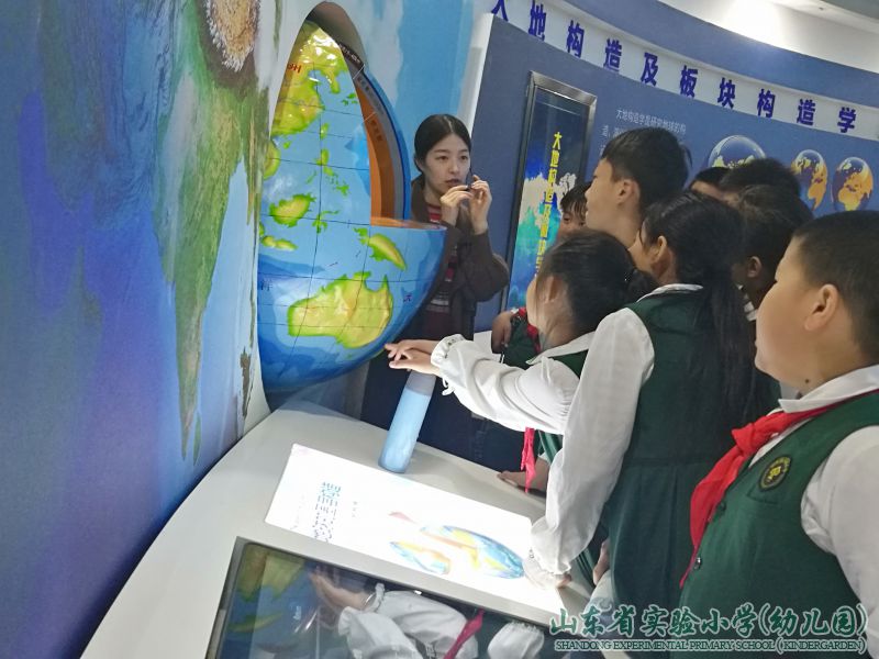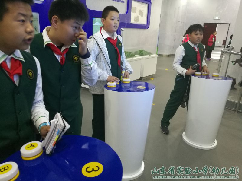 队员们在地震台讲解员的带领下,参观地震科普馆,听讲解员阿姨介绍。“山东省地震台网中心“主要承担全省各类地震监测台网(测震、强震、前兆、GNSS)数据的汇集、存储、管理、交换与服务,开展地震科学技术研究等工作 。2017年正式开放的”地震科普馆“,展厅面积约800多平方米,共有各类展品(展项)100多项。馆内设有三个展区,分别为展示区、体验区以及雕塑区。