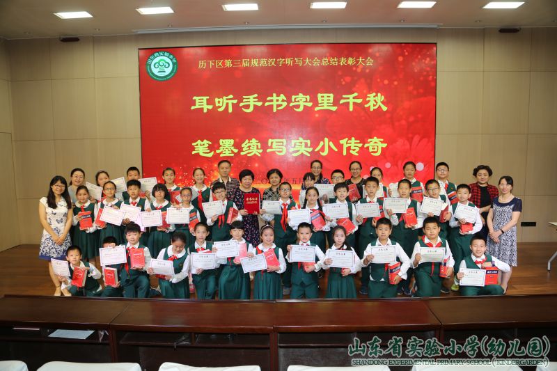 2018年1月6日,我校来自三四五年级的32名参赛选手代表学校参加了历下区第三届中小学生规范汉字听写大赛。汉字听写大会的筹备过程历时整整两个月,13 个赛区,48 所学校,1681 名学生参加比赛。经过激烈角逐,535人获奖,获奖率31.8% ,其中197 名学生荣获一等奖, 一等奖获奖率为11%。在我校出战的34名选手中,获奖率达到94.1%,一等奖获奖率达到56.3%。我们学校也以连年夺冠的骄人成绩再次获评为优秀组织单位。