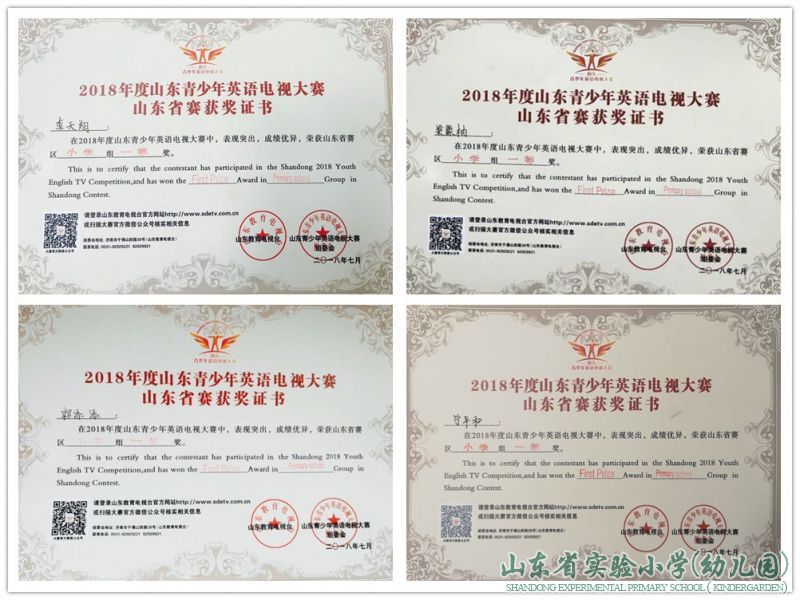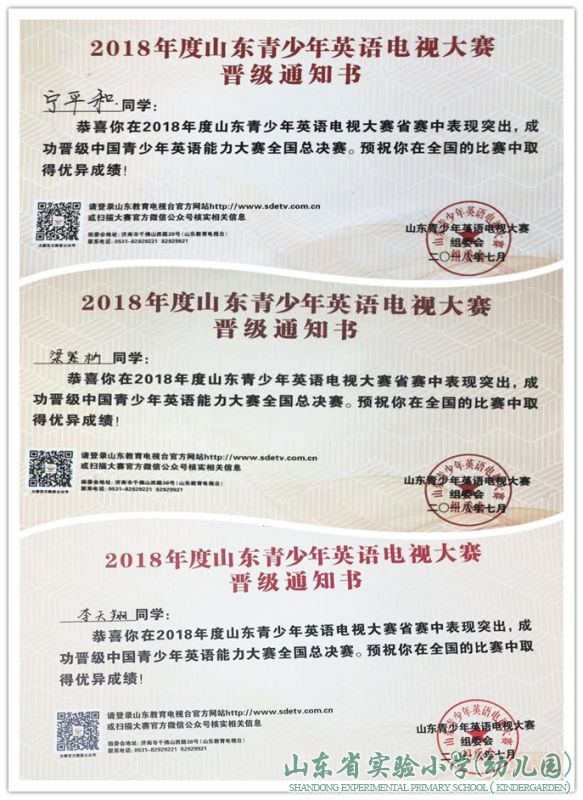 2018年7月7日至7月9日,在章丘舜耕生态园举行了山东省青少年英语电视大赛的省级决赛。省实验小学学生在决赛中表现优异,四年级三班郭添添,五年级一班宁平和,六年级一班李天翔,六年级四班梁紫枘分获山东省赛区小学组一等奖。其中,宁平和、李天翔、梁紫枘三名同学因为在省赛中表现突出,成功晋级中国青少年英语能力大赛全国总决赛。