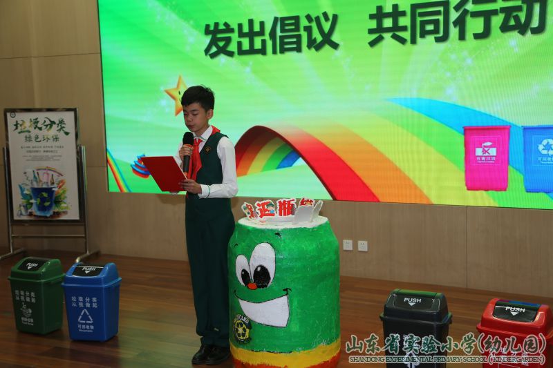 最后大队委队员杨博文向大家发出垃圾分类的倡议,把自己制作的用来收集废弃的塑料瓶的容器——“小宝”展示给大家,让大家以后将废旧的塑料瓶就放在“小宝”里面,培养大家从小养成垃圾分类的好习惯,为我们的美好环境贡献自己应有的力量。