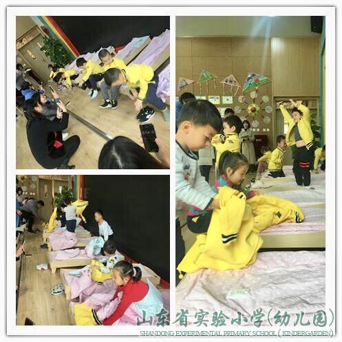 看到我们一个个精神抖擞,干劲十足的小脸了吗?孩子们分组上台,一个个迅速地行动了起来,舞着小手,各显神通。有的麻利的穿衣服,有的熟练的平铺被子,动作流畅,一气呵成。小朋友们将自己的自理能力展示到家长和老师面前,用自己的行动告诉大家:我们长大了,我们自己能行!