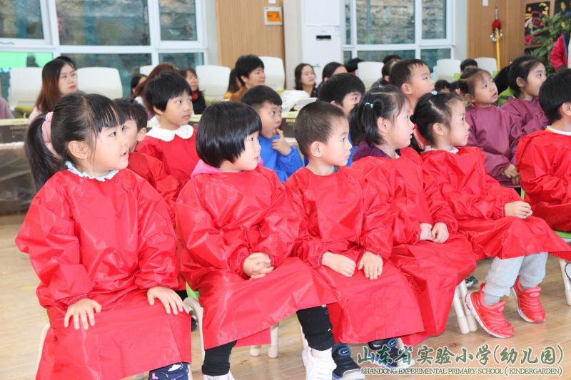 主持人董老师问“孩子们过生日了,你们最想干什么呀,过生日最想吃什么呀!”我们当然想吃蛋糕了!“今天呀你们的生日,你们自己做主!赶快拿起你身边的小围裙穿到身上吧,穿好装备我们来做一个精致美味的蛋糕!”围裙后面的带子有很多小朋友系不上,小学来的大哥哥、大姐姐们帮助我们幼儿园的小朋友穿上了围裙!我们还能互相帮助呢! 哥哥姐姐帮我们穿好了围裙,我们要对哥哥姐姐说谢谢!现在,我们都准备好了,我轻轻的搬着我们的小椅子走到爸爸、妈妈的跟前了!我们认真的坐在爸爸、妈妈的前面,期待着亲手制作蛋糕。
