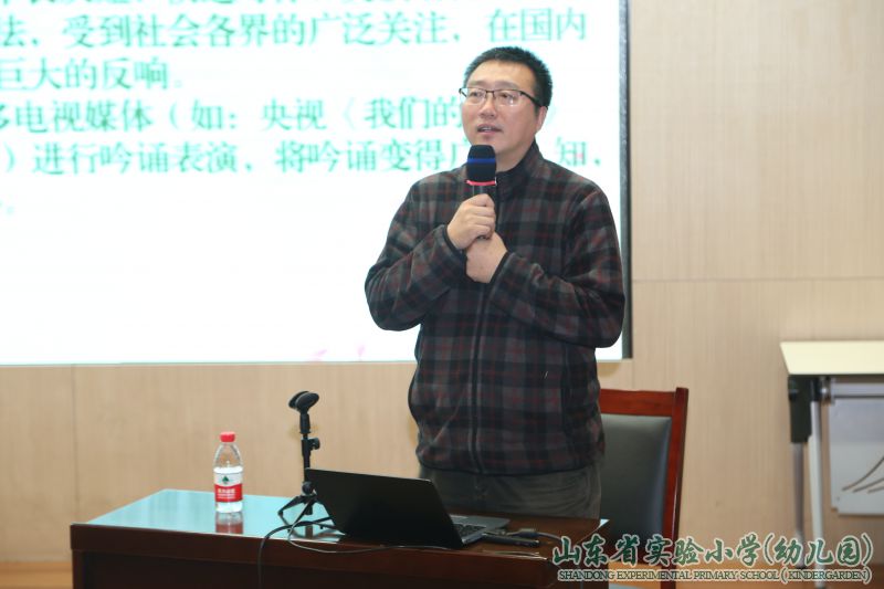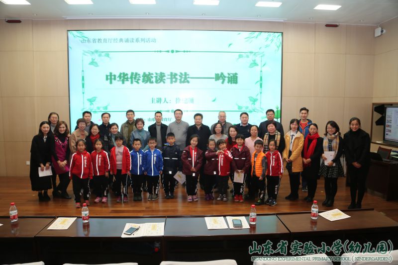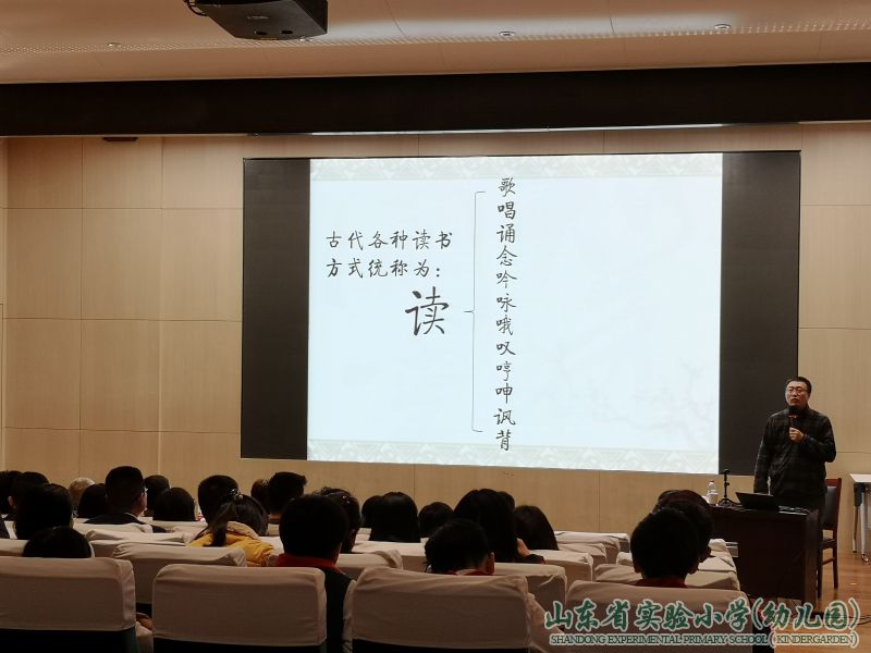为贯彻落实《关于实施中华优秀传统文化传承发展工程的意见》,传承弘扬中华优秀传统文化,通过诵读道德经典,营造知礼守礼、文明向上的良好氛围, 12月21日下午,山东省教育厅经典诵读系列活动之“中华传统读书法——吟诵”主题讲座在山东省实验小学举办。山东省语委办主任孙祖兴、教育厅机关党委副书记丁健以及来自教育工会、省语委办、厅机关各处室的领导与实小师生一同参加了此次活动。