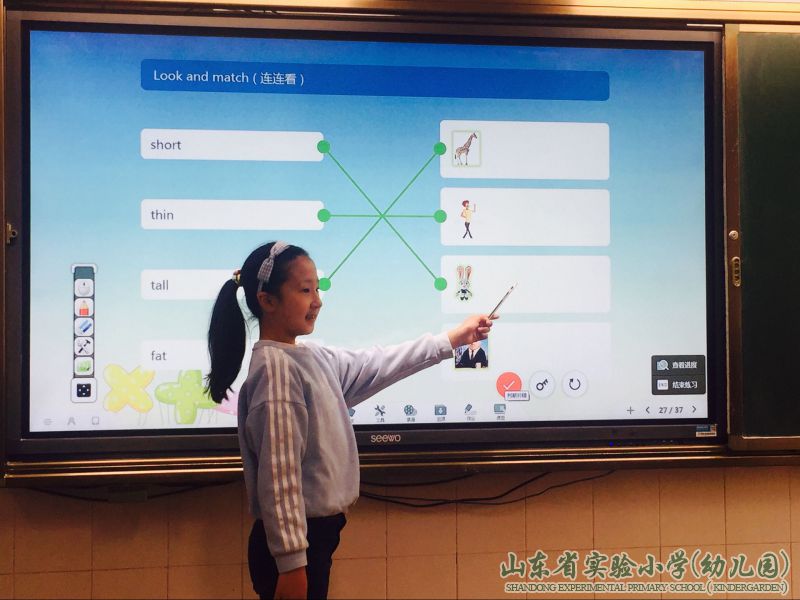 随后,刘老师通过熟练运用”教学助手“的多项功能实现了单词书写示范、题目下发、题目批改、作业展示、抢答、随机抽答等教学环节,并鼓励学生上台做题和领读,给了学生们更多的展示练习的机会。
