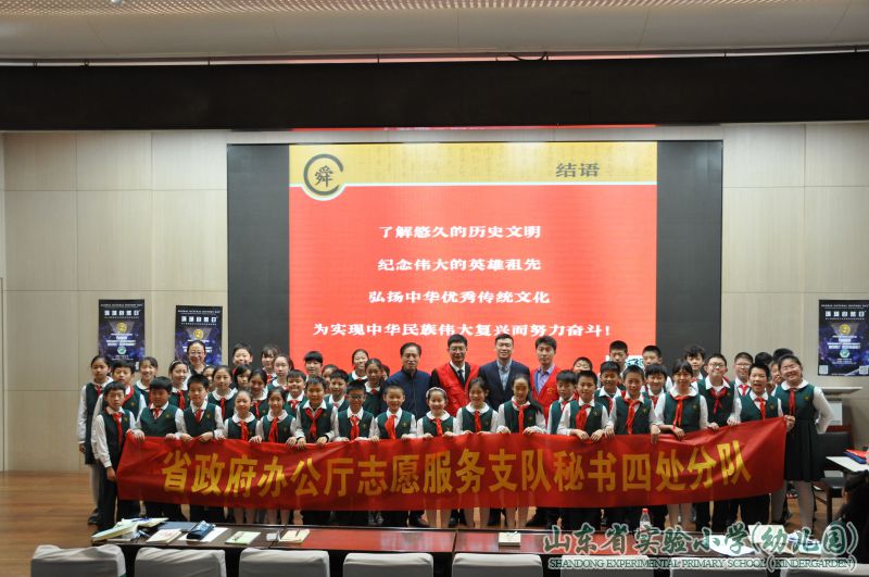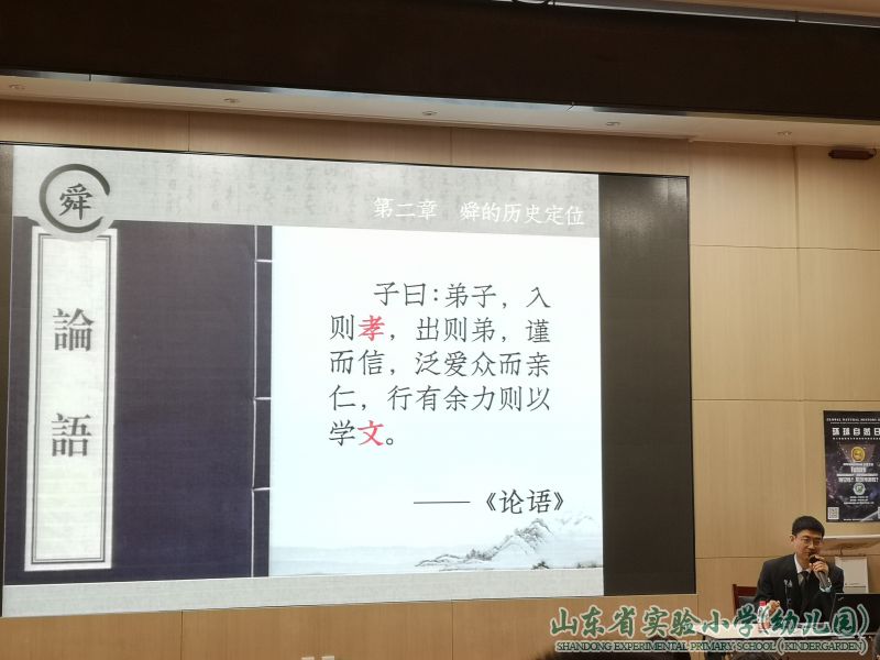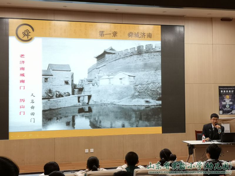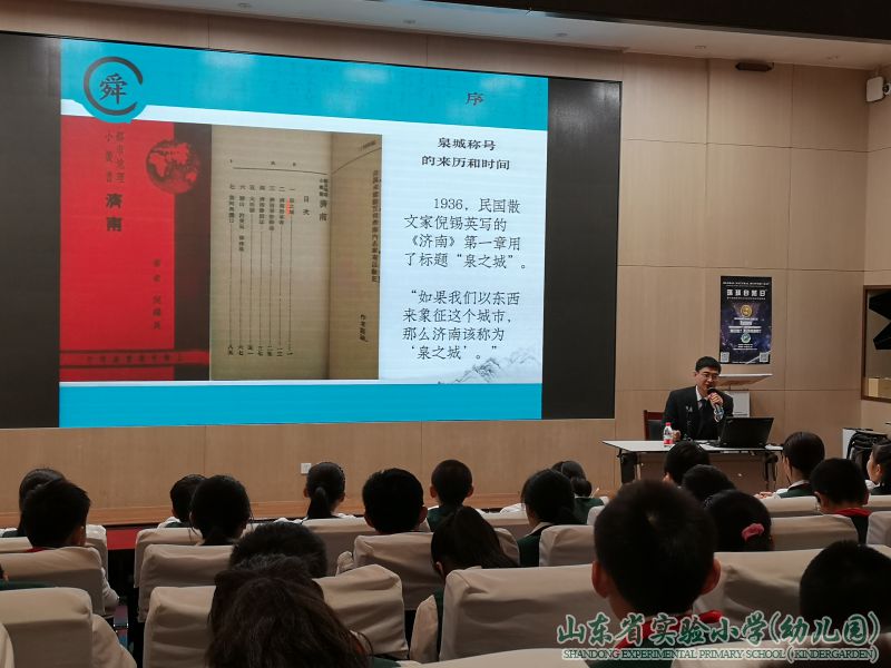4月18日上午,在一楼报告厅,山东省政府办公厅一级调研员、山东省大舜文化研究会副秘书长、“舜城之光”舜文化宣传志愿者赵志刚老师应邀来到山东省实验小学,为全校老师和五年级部分学生举行了一场精彩的《舜城济南》传统文化讲座,开启了在座师生对济南文化的探索之旅。
