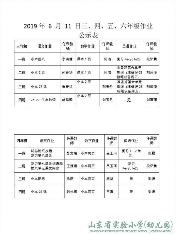 2019年6月11日三、四、五、六作业公示表