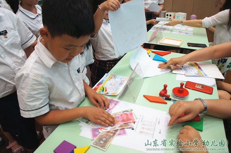 “学以致用”这一环节里,老师们引导孩子们以动手操作的方式展示所学知识,解决问题:用七巧板中两个三角形拼出大三角形、平行四边形、正方形;用人民币买东西;按规律推测数字和图形等等。