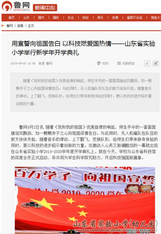 鲁网新闻中心:用宣誓向祖国告白 以科技燃爱国热情——山东省实验小学举行新学年开学典礼