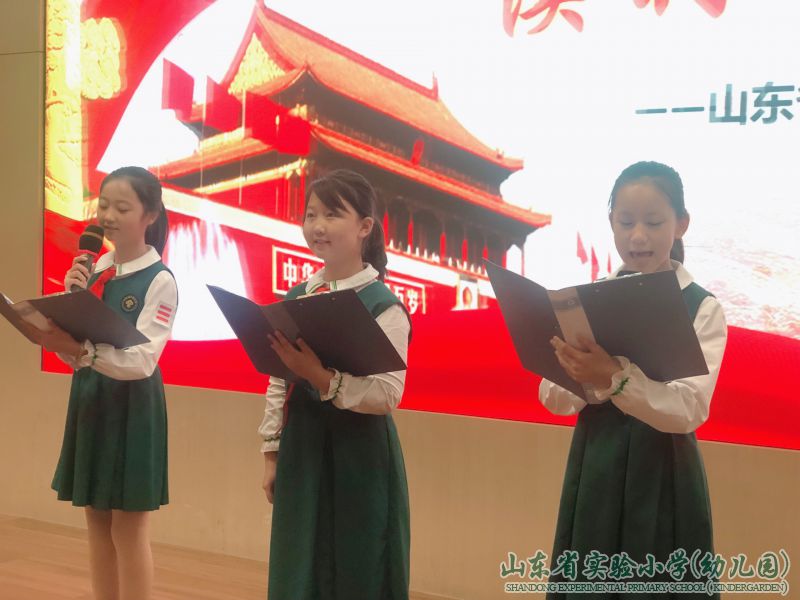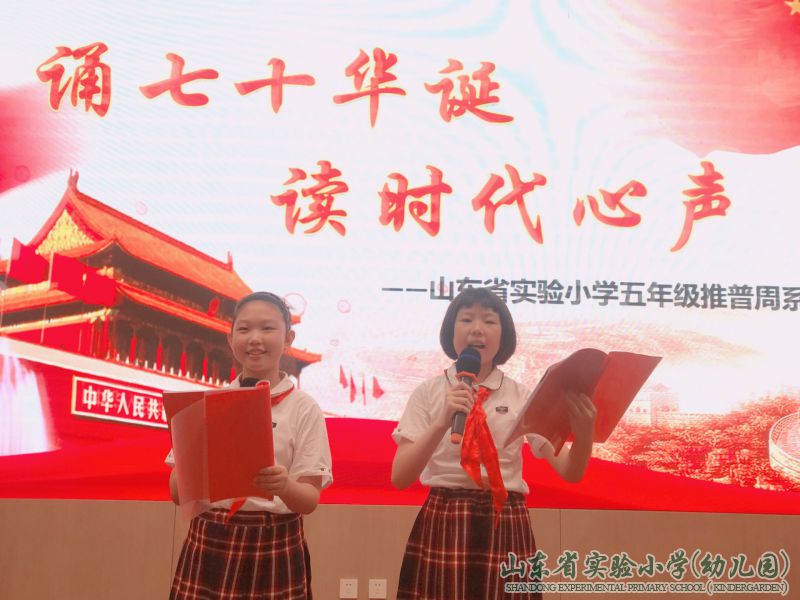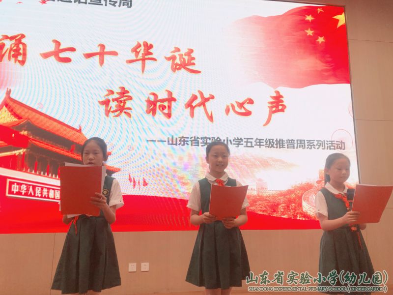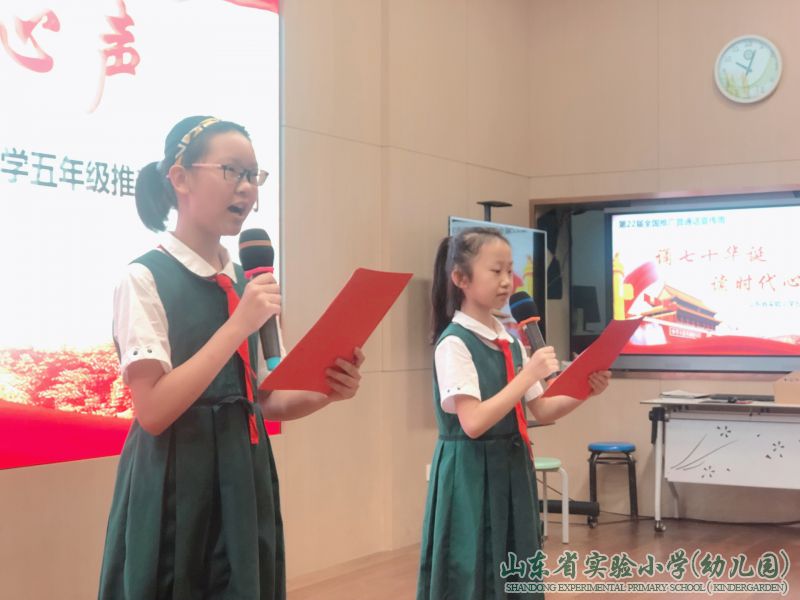 五年级的同学们还举行了“诵七十华诞 读时代心声”爱国诗歌诵读活动,同学们积极参与,提前两周精心挑选爱国诗歌,每位朗诵的同学都激情满怀,诵读了一个个爱国的诗篇,听得台下的同学们热血沸腾。这次诵读活动让同学们在学习过程中提高文化和道德修养,增进爱国情怀,陶冶了学生的情操,净化学生的心灵,全面提升他们的思想道德水平和爱国情怀,提高了普通话水平。
