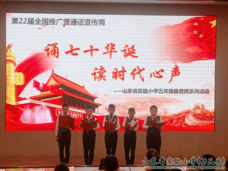 山东省实验小学在全校范围内宣传国家语言文字法律法规和规范标准,弘扬爱国主义精神,教学处认真制定了推普周活动方案,将推普活动与爱国主义教育有机结合,期间开展一系列形式多样、特色鲜明的推普周活动,积极营造推普氛围,引导广大师生提高学习掌握国家通用语言文字的法规意识,着力创建一个规范、健康的校园语言文字应用环境。