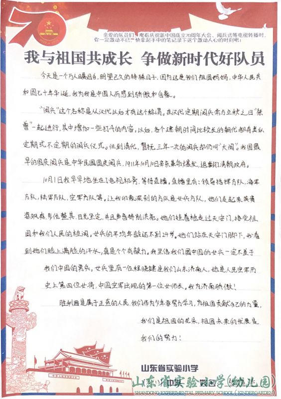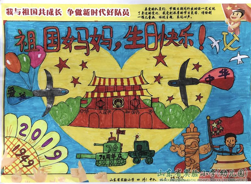 为庆祝新中国成立70周年,激发少先队员们的爱国热情,国庆期间,山东省实验小学紧紧围绕“不忘初心、牢记使命”主题教育,结合新中国成立70周年、少先队建队70周年,以“我与祖国共成长”为主题开展了形式多样、特色鲜明的活动。队员们情绪高涨、积极参与,用实际行动向祖国70华诞献礼!