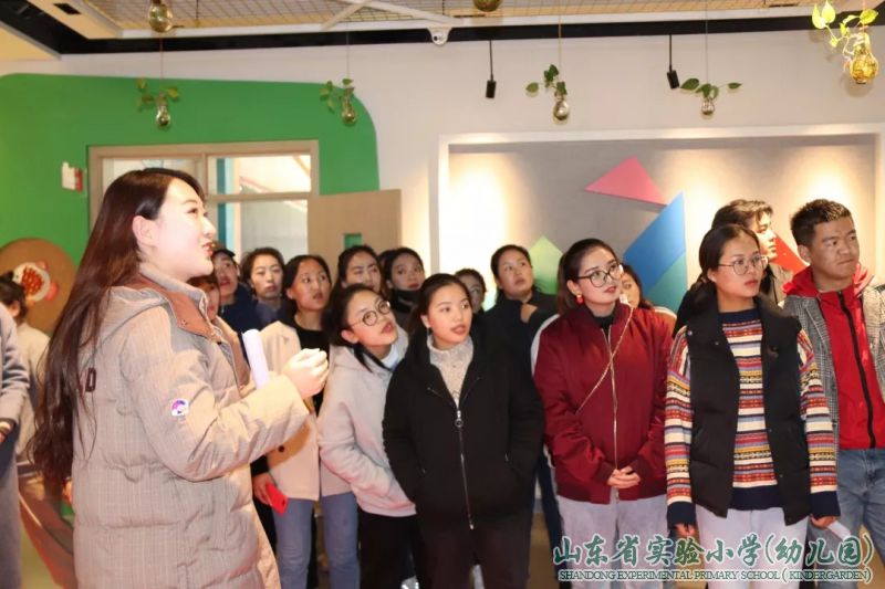 董文欣老师带领见习生们参观了幼儿园的环境创设及各班的区域活动,见实习生们对环境创设和班级内的材料投放有了更深的认识,原来幼儿园的每一面墙,每一个角落都会说话,它们的背后呈现的都是老师的教育智慧。
