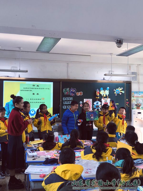 在《怪兽奇想》美术课上,魏梦飞老师运用了AR投屏的技术,将怪兽的形象直接投放在了学生之中,极大的激发了学生的兴趣,在教学环节中又利用学生们熟知的皮卡丘、哥斯拉、以及怪兽大学里面的怪兽形象引出了本节课的重点知识,接着魏老师拿出了课前精心准备的小道具,请同学来黑板上发挥想象拼出一个个奇怪的怪兽形象来,通过学生们感兴趣的方式解决的本节课的难点,同时体现了学生主体地位。