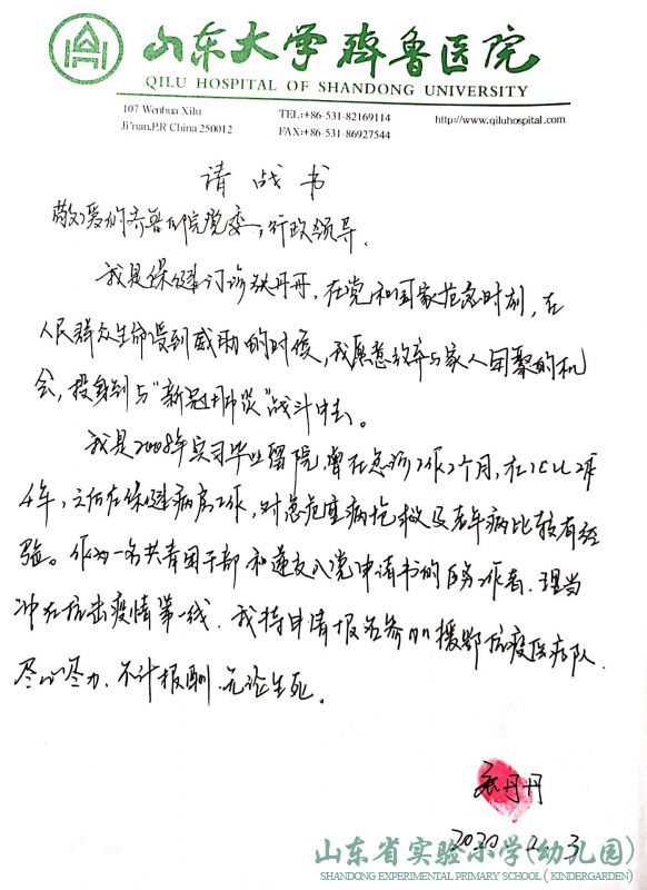 大年初一爸爸、妈妈的医院就组织援助湖北抗击疫情国家医疗队,这一次妈妈却对我说了谎。妈妈说好的两周以后就来接我回济南,可她却报名参加援助湖北医疗预备队。电话里,妈妈对我说,现在湖北武汉的疫情非常紧急,已经有153名齐鲁医院的叔叔阿姨奔赴抗疫一线和省内疫情一线,如果疫情继续蔓延,千千万万的家庭就不能出门,学校也不能开学,她们回到医院返岗是在与时间赛跑与病魔较量,只有跑得快,才能跑赢时间,才能从病魔的手里抢下更多的病人,阻止疫情的蔓延。