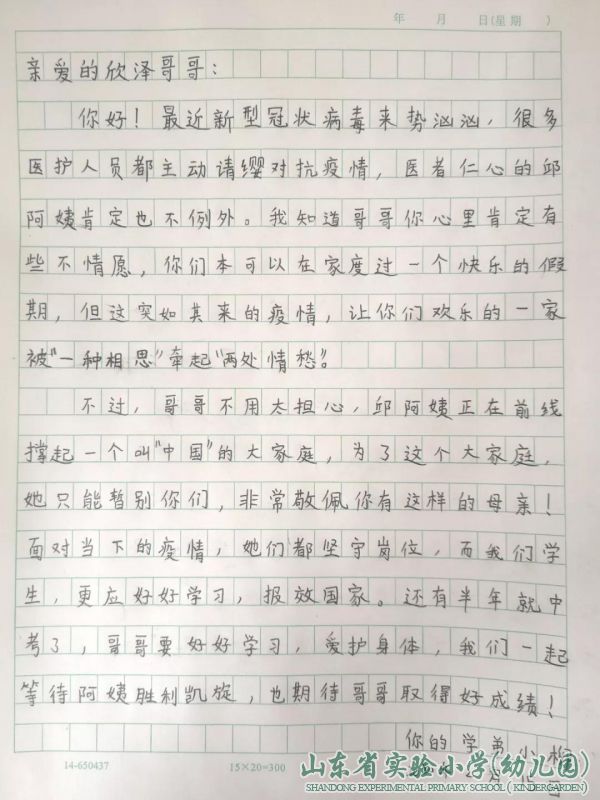 我们时刻牵挂着邱阿姨,不断关注前方有关邱阿姨的新闻。看到一篇篇新闻报道,我们激动不已,感动万分。尤其是抗“疫”一线发来的家书,见字如面,纸短情长,邱阿姨用最朴实的方式,诉说着对儿子的那份牵挂,祝福,加油及嘱托。