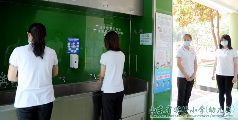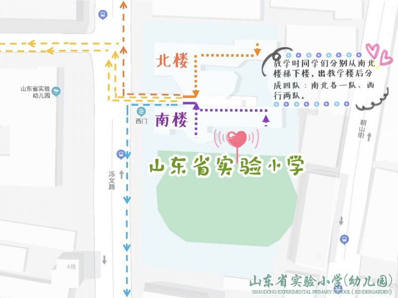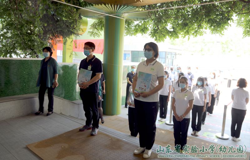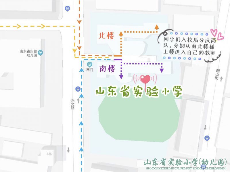 为了避免人员聚集,学校实行错时上学。学校地处泺文路繁华路段,学生上学一般有三条路径,学校南北两侧人行道及对面小路口,执勤老师会在家长止步线提醒学生间隔一米有序排队入校。南、北、中入校的学生分别对应三条通道进入校园。