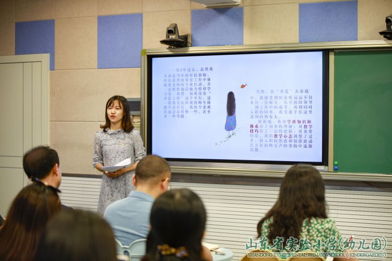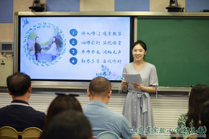 指导教师代表贺文清同志回忆了自己在教师成长路上遇到的恩师,老教师解疑答惑和悉心关怀照亮了前进的方向,使她不断成长!而今,已为指导教师的她把自己在教学中所得的经验和感悟与青年教师分享,她相信青年教师在省实验小学这个大家庭,一定能够找到实现自己职业理想的那双翅膀。