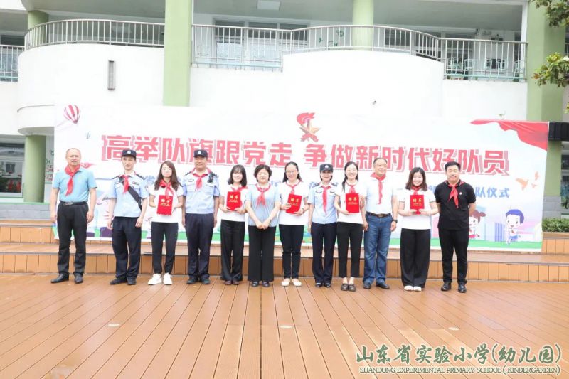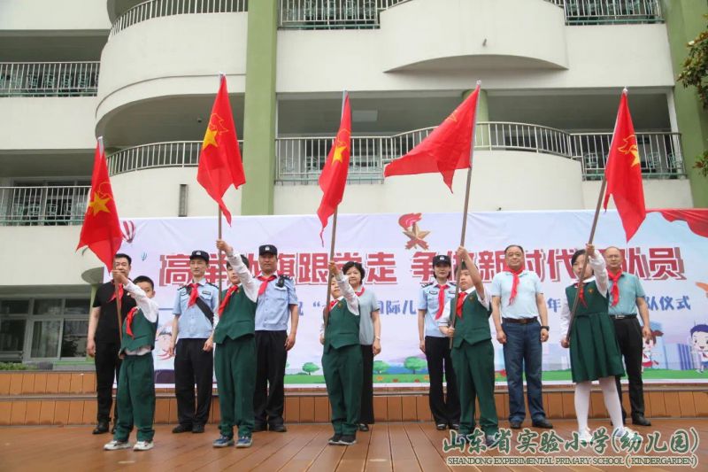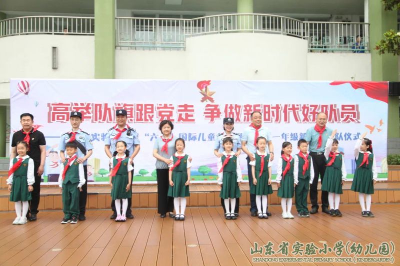 鲜红的少先队队旗迎风飘扬,嘹亮的少年先锋队队歌响彻校园,2021年6月1日上午九点山东省实验小学隆重举行“红领巾心向党,争做新时代好少年”——“六一”国际儿童节主题队日暨一年级新队员分批入队仪式。