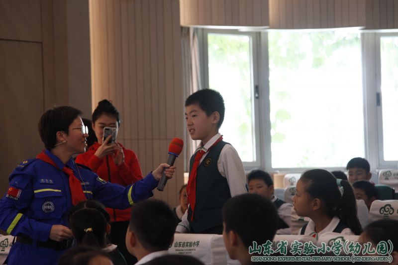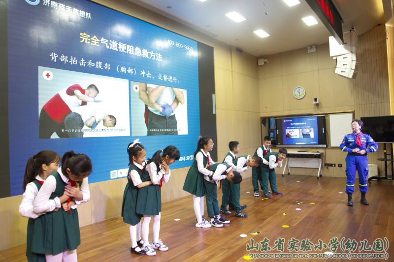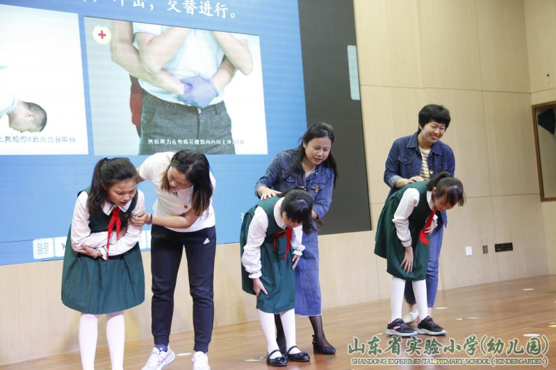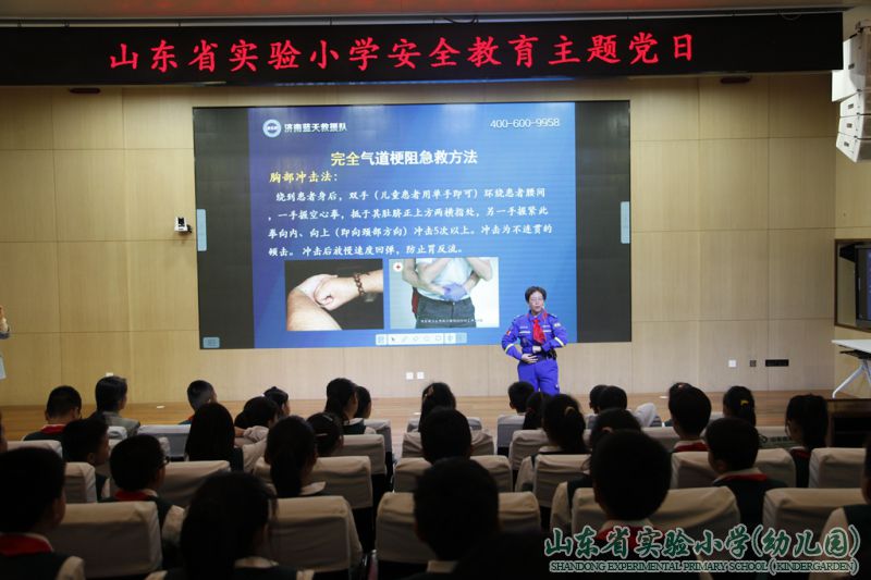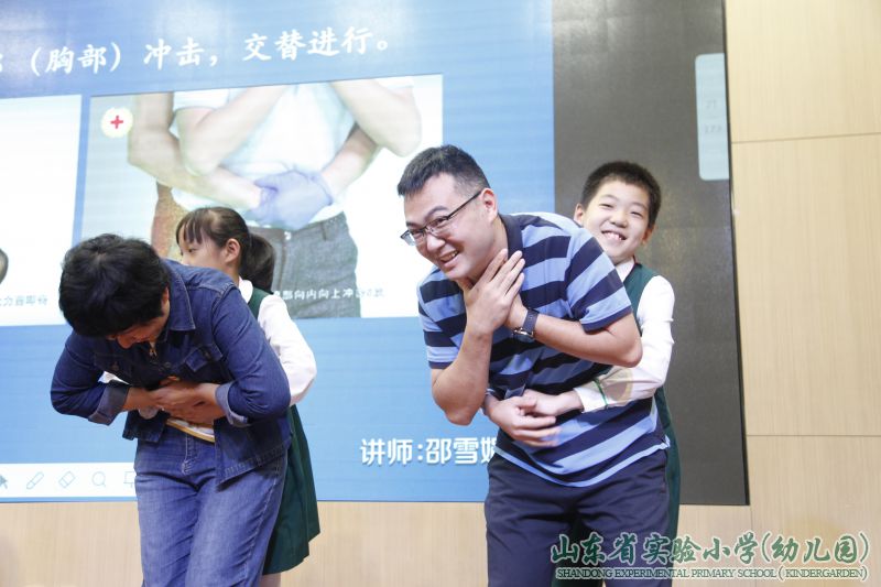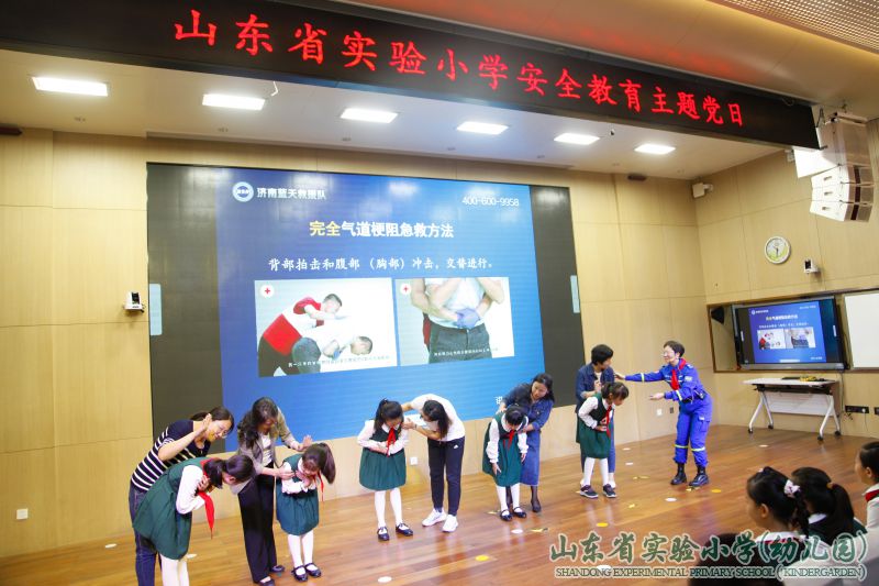 “剪子包袱锤,海姆立克显神威。背后环抱,在肚脐以上两横指,拳心向内,另一手掌紧握拳头,向内、向上挤压……”9月29日上午,在山东省实验小学的多功能厅里,一场主题为“‘蓝天’护平安,安全记心间”的安全教育主题活动正在热烈地举行。