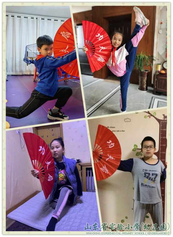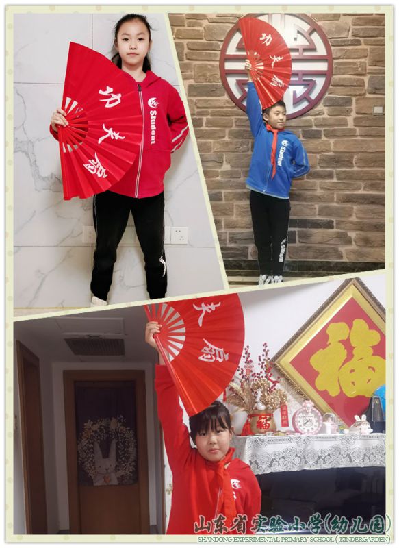 “宅”家学习燃起来,学生们最喜欢的内容是练习“功夫扇”啦!开步抱扇,弓步举扇,孩子们把一招一式打得神气十足,虎虎生威,淋漓尽致地展现了阳光少年健康向上的精神风貌!文其精神,武其体魄,这样的课程设计着眼学生五育并举、全面发展,深受学生们的欢迎,让学生的居家学习和生活更加健康快乐!