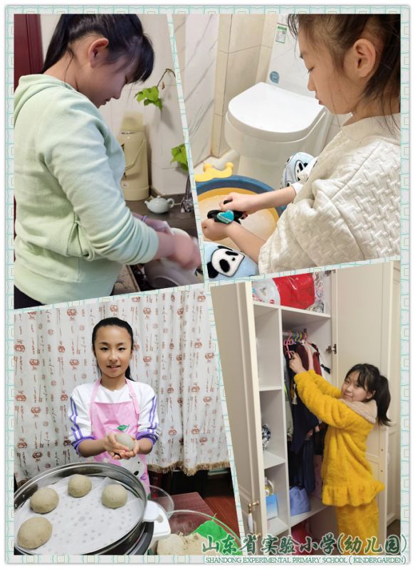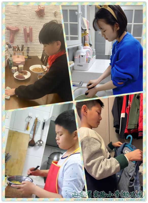 五年级同学们居家生活的安排井然有序,学习之余则有更多的时间进行劳动体验了。瞧,他们正积极地通过居家劳动,锻炼自己的动手能力,分担父母的家务活。同学们用实际行动体悟“家”的责任,表达对家长的感恩之情。劳动小能手们,让我们一起为抗“疫”加油!