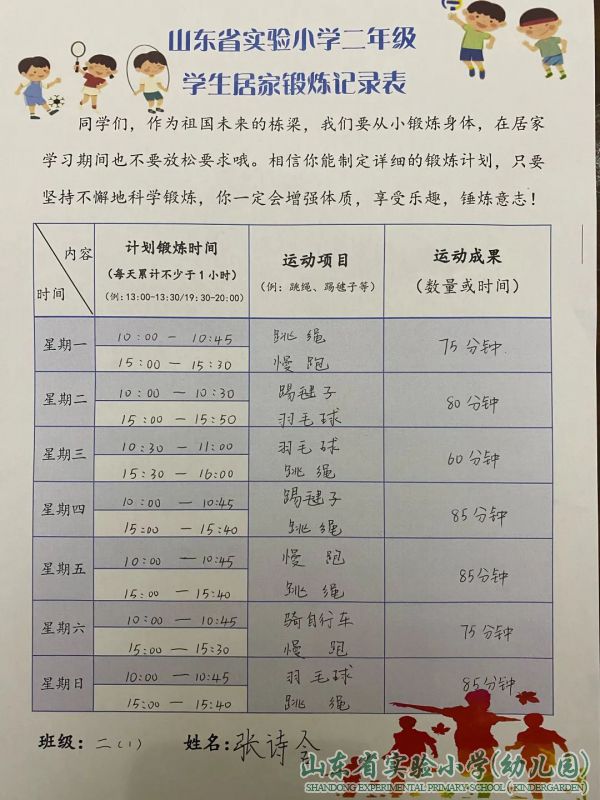 作为一名当代小学生,加强体育运动必不可少。在老师的指导和家长的帮助下我制定了自己的居家锻炼表,有跳绳、拍球、踢毽子等多个项目。妈妈要求我每天跳3组绳,每组一分钟,每天坚持做30个仰卧起坐和练习武术操。对啦!像横叉,竖叉,搬旁腿、下大腰等舞蹈的基本功我也会每天练习。