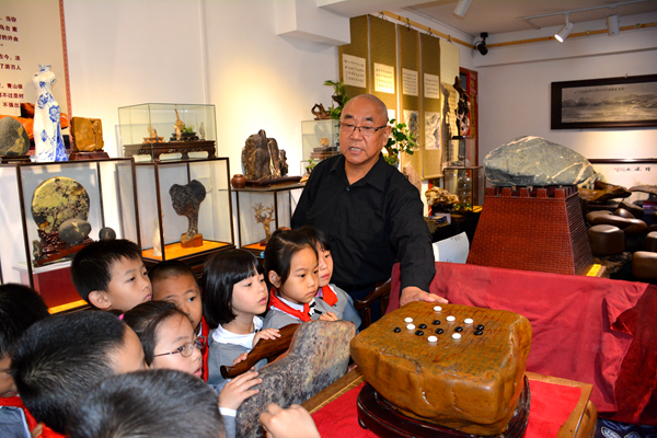 办的中华齐鲁石齐化会馆。王老带孩子观赏自己珍贵的奇石,更难得的是通过每组奇
