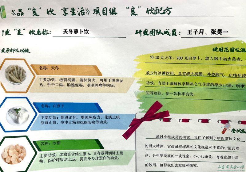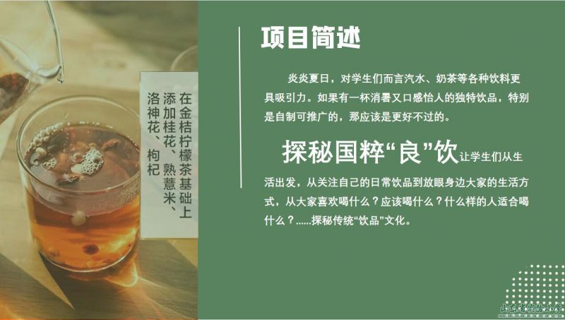 此次项目研究,让学生在实践中为自己或同伴、家人动手打造一款独具特色的健康饮品,在实践中感受中医文化的博大精深;感悟自然与人的和谐相依;在劳动中引导学生改变生活态度,提升生活品质,坚定文化自信,增强爱国思想,养成从事探究活动的正确态度和实事求是的科学精神,全面促进学生核心素养的提升。
