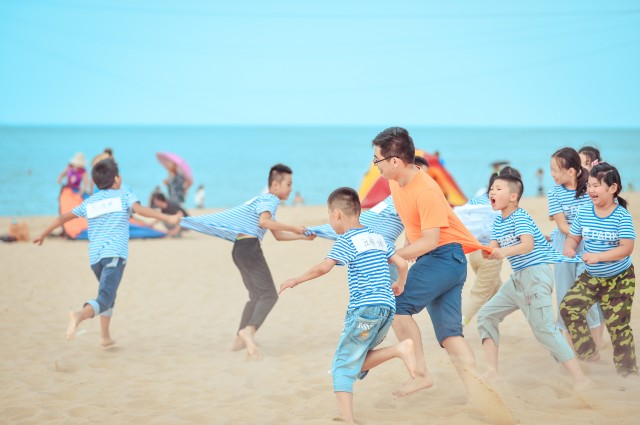 在进入营地之前,先带着孩子们去美丽的那香海沙滩,来一场撕名牌对决。用老鹰捉小鸡的方式,看看哪一队最先获胜吧!玩游戏就是有输有赢才好玩,输了的队别着急哭,快来勇敢的接受惩罚吧! 受了惩罚还能这么开心,笑的这么灿烂,让我怎能不喜欢你们这群可爱的孩子们呢?