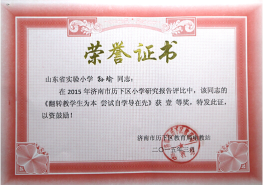 在历下区电教站举办的研究报告评比中,孙瑜老师荣获一等奖。