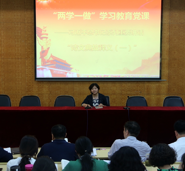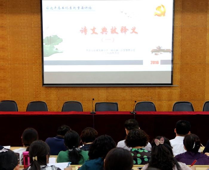 之后,在党总支书记苗建同志的带领下,全体党员开始上“两学一做”学习教育党课。全体党员观看了我校(园)自行设计、制作的微视频——《习近平总书记系列重要讲话“诗文典故释义”(一)》,党总支学习宣传委员兼第一党支部书记郑国栋同志在微视频的演示中进行了同步的讲解。