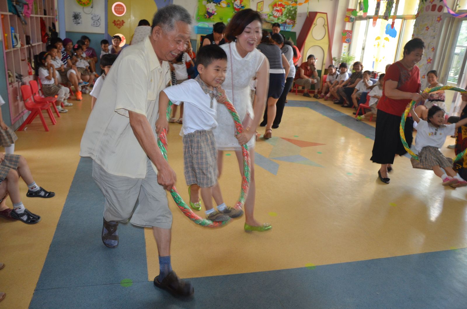 最后是亲子游戏部分《喊数抱团》、《步调一致即(毛毛虫) 》、《圈圈乐》、《齐心协力》和幼儿拍球比赛等,家长积极参与,连爷爷奶奶都不甘落后,加油声,欢笑声,时时爆发,用家长的话说:玩的特“High”。
